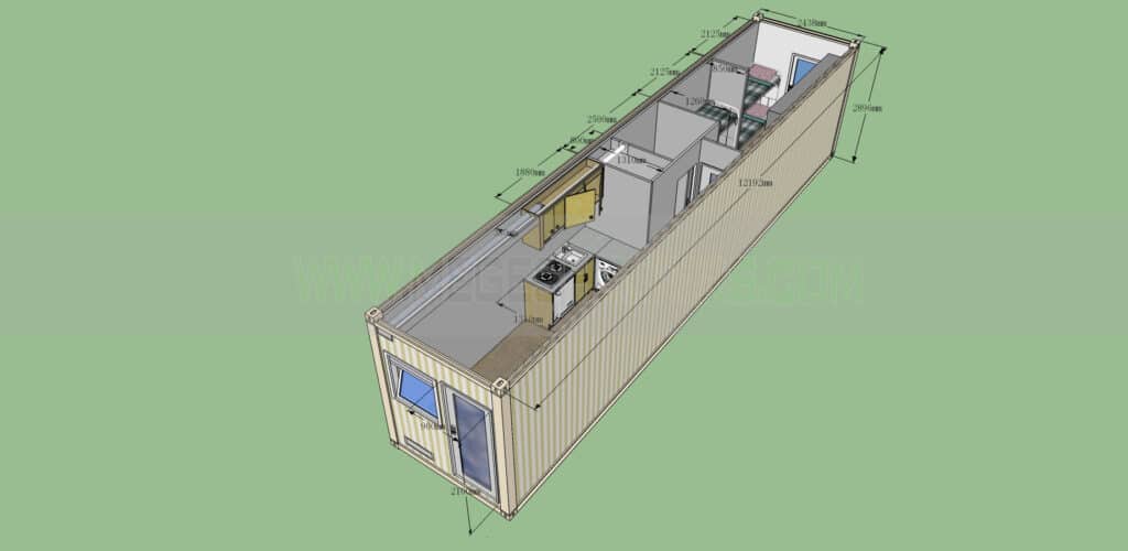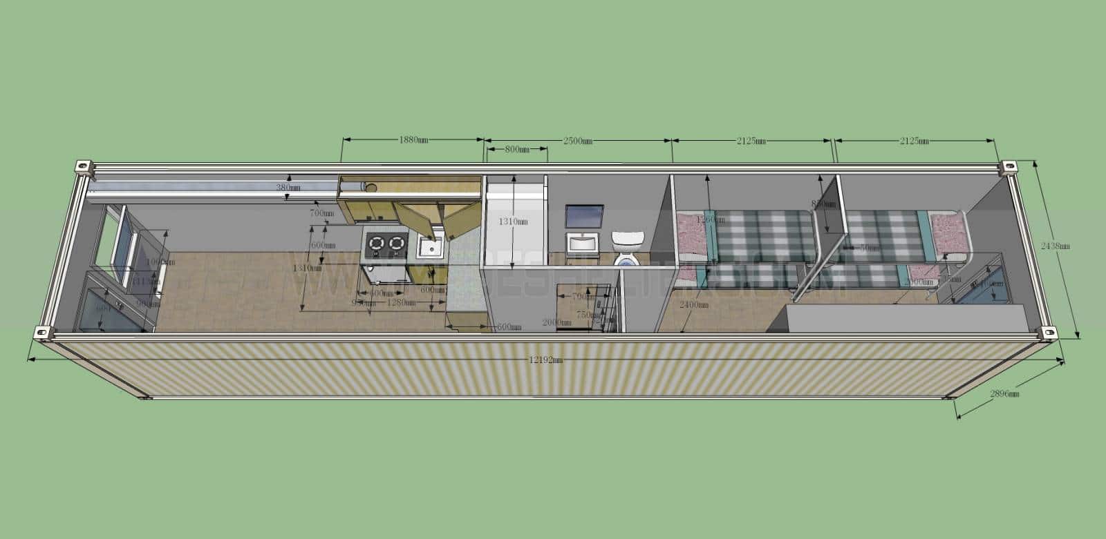 The single unit can have two bedrooms and more units can be added for additional space. The unit features 2 bedrooms, bathroom, sitting area deck and kitchen area.